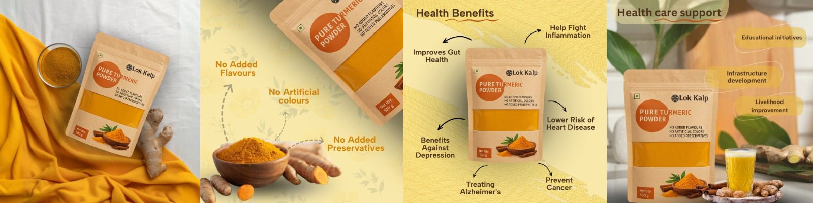 Experience the richness of Lok-Kalp Foundation Pure Turmeric Powder, sourced from 32 Villages adopted by Lok-kalp Foundation directly from farms to your kitchen. Our turmeric powder is a testament to quality and purity, free from additives or preservatives. Known for its vibrant color and powerful health benefits, turmeric is celebrated for its anti-inflammatory and antioxidant properties. Incorporate Lok-Kalp Foundation Pure Turmeric Powder into your daily recipes such as curries, soups, smoothies, and even skincare routines for a natural glow. By choosing our turmeric powder, you support sustainable farming practices and enjoy the genuine essence of this golden spice. Elevate your wellness journey with Lok-Kalp Foundation Pure Turmeric Powder today!